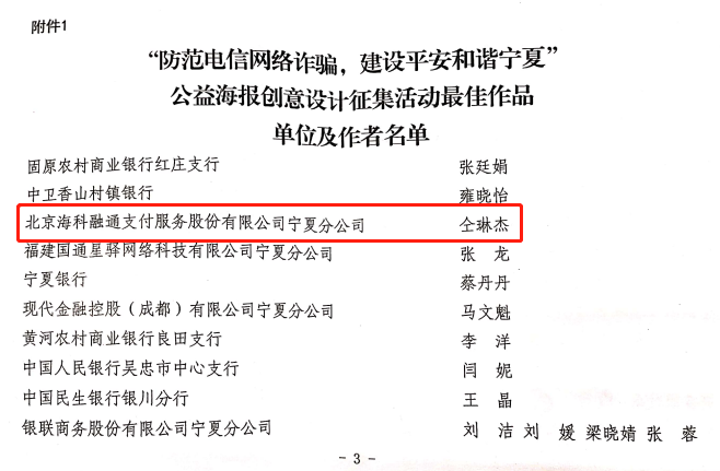 近期,获奖海报作品终于进入张贴阶段!印有“北京海科融通支付服务股份有限公司”字样的公益宣传海报,出现在了宁夏的大街小巷、商场超市、楼宇电梯、乡村集市,在宣传“防范电信网络诈骗”知识的同时,也让更多人知道了海科融通这家优秀企业。